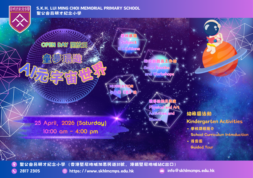 本校將於2026年4月25日(星期六)舉行學校開放日,主題為「童夢環遊・AI 元宇宙世界」。當日活動豐富多彩,涵蓋學科展覽、攤位遊戲、工作坊及學生才藝表演,並設有2025/26學年「心繫家國」冠名活動「霓裳裏的中國」華服親子設計比賽頒獎禮。學生亦可參與「旅行家勳章計劃(主題景點與護照蓋章)」,以正向積極的態度面對困難與挑戰。完成任務後可累積積分兌換小禮物,寓學習於娛樂,我們誠邀家長攜同子女及親友蒞臨,共同體驗並分享學生們的豐碩學習成果。
